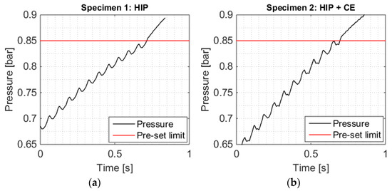Crack detection by the eSHM system when capillary pressure exceeds 0.85 bar. The figure depicts the last second of the pressure recording inside the capillary of (a) Specimen 1 (HIP) and (b) Specimen 2 (HIP + CE).