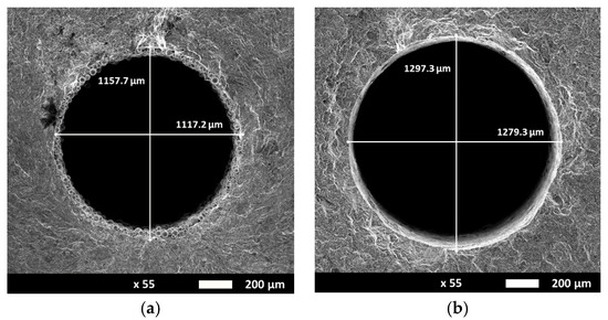 Capillary cross section of (a) hot isostatic pressing (HIP) specimen (Specimen 1) and (b) a specimen with HIP and Chemical Etching (CE) post process (Specimen 2). CE reduced capillary surface roughness, removed unmolten metal powder particles and enlarged the capillary diameter by about 150 µm.