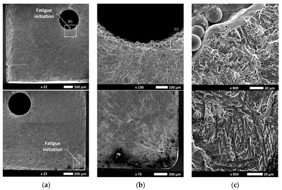Fracture analysis of hot isostatic pressed (HIPped) specimen 1 (top) and specimen 2 with HIP and Chemical Etching (CE) post process (bottom) with detailed views presented in columns (b) and (c). Specimen 1: the fatigue crack initiated at the capillary surface due to the as-built capillary surface roughness (c). Specimen 2: the fatigue crack initiated subsurface near the bottom right corner. The fracture surface of both specimens shows the presence of facets (depicted in column (c)), a clear indication for the fatigue initiation phase.