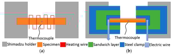 There are two main ways to heat the specimen in the SEM environment. One method is electric resistance wire heating, which transfers thermal energy to the specimen by the way of radiation or conduction as shown in Figure 1a. The other method shown in Figure 1b is Joule effect heating the specimen by passing the electric current directly through the specimen. Usually, using radiation heating method to heat the specimen, its temperature is difficult to exceed 700 °C because thermal electrons affect the secondary electron imaging in our SEM system of Shimadzu SS-550, which causes serious image quality degradation [6]. To the conduction heating, it is difficult to dynamically load and distinguish the load existed on the specimen due to the contact of the tested specimen with the heat source. Therefore, we designed a resistance heating unit to replace the thermal radiant heating module used in the Shimadzu SS-550 system, and employed a thermocouple, which was fixed in the center of the specimen, to real-time monitor the temperature of the specimen. Figure 1b shows the schematic of the heating unit.