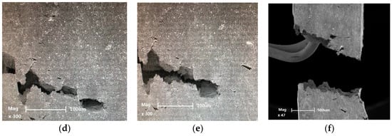 The fracture mode of Ni-based superalloy was represented by three types: crystallographic plane facets fracture, mixed fracture mode and non-crystallographic fracture (I type fracture) from the low temperature to high temperature (>700 °C) [2]. This mainly relates to the actuation of the sliding surface and the behavior of dislocation activation. To observe the fracture process of Ni-based alloys at high temperature (>700 °C) in the real time, we performed the in-situ tensile experiment of Ni based superalloy with [001]/[011] orientation at 900 °C. Figure 3a–f showed the initiation and propagation of cracks during the stretching process. It was worth noting that Ni-based superalloy began to crack from the left of the section. This was mainly due to the presence of a certain amount of carbides around the location of the material, which led to the formation of a large number of microcracks or holes. When the external load was 70 N, the surface of the material had already undergone microcracks before yielding. The upper right corner of Figure 3a was a partial enlarged view. With the increase of the load, the number of microcracks gradually began to increase. Then, holes or microcracks would grow up and connect to each other under the action of the load. It was found that in the process of crack propagation, new holes were formed at the front of the main crack, as was shown in Figure 3e. Finally, the tested specimen failed due to voids connecting and the crack propagating through the specimen section. Figure 3f shows the fracture morphology of the specimen. It can be seen that the phenomenon of necking occurs near the middle of the specimen, which is consistent with the results of Wang et al. [8].