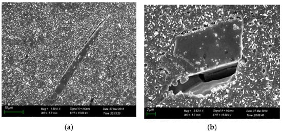 In general, the failure of Ni-based superalloy material originates from the sites of stress concentration. The main cause of stress concentration is the presence of defects in the material, including, MC, holes, precipitates phase and so on [9,10]. Figure 4a,b showed the two different morphology, rod and block shape, of carbide inclusions after tensile failure for PWA1483 Ni-based superalloy at 900 °C. We found that the carbides were integral and only debonded with the matrix. For the block-shape inclusions, holes can be found at the debonding interface, whereas for the rod-shape inclusions, only cracks were formed. By counting the inclusions on the surface of the specimens after failure, it was found that the number of cracks originating from inclusion debonding was far greater than the number of inclusions from which cracking occurred at 900 °C. However, at low temperatures, there was a competitive relationship between cracking and interface debonding of the carbide inclusion under the same level of the external load. Researchers found that the tendency of carbide cracking decreased and more carbide-matrix interface debonding were observed with increase temperature for CM 247 DS alloy [10]. This was consistent with our experimental results. The reasons were due to the different coefficients of thermal expansion and stress concentration caused by the external load. When the interfacial strength was below the stress concentration near interfaces, carbides-matrix debonding took place, and then, cracks or voids were generated. Considering the tensile test heated by the continuous electric currency, it existed the effect of local joule heating due to the different resistivity between the carbides and matrix, which caused non-uniform temperature [11]. It also increased the thermal mismatch between them, resulting in carbide-matrix interface debonding.