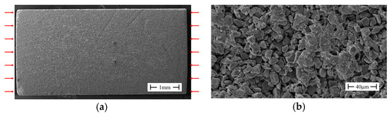 SEM micrograph of a representative specimen. (a) Macroscopic; (b) Microscopic. Note: (i) Average grain and pore size are both about 10 μm; (ii) Red arrows show the loading direction.