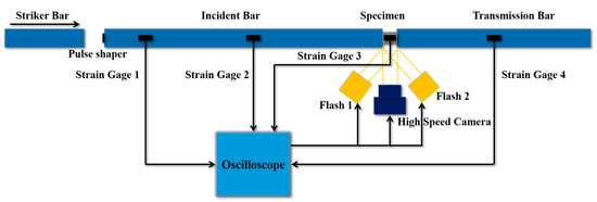 Schematic setup of SHPB with a high-speed camera system. Note: (i) Compared to conventional SHPB set-up, a copper pulse shaper is placed on the incident bar end; (ii) Strain gage 1 is used to trigger oscilloscope and the high-speed camera and the flashlights are then triggered by the oscilloscope, and strain gages 2 and 4 are used to record the reflected and transmitted signals. Strain gage 3 is mounted on the specimen to measure the strain directly during its deformation process.