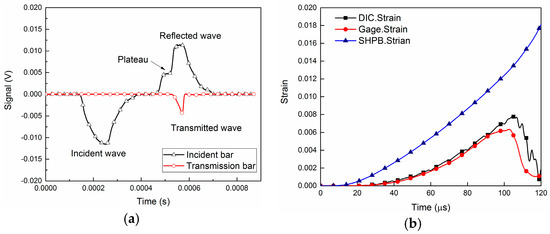 (a) Typical original oscilloscope data of SHPB. The reflected wave has a plateau in the start region; (b) Comparison of strain calculated by DIC method, SHPB method, and strain directly obtained from strain gage attached to the specimen.