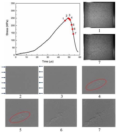 Failure process images of a represent dynamic test. Note: (i) The numbers under each picture corresponding to the number marked in the curve; (ii) t1 = 46 μs, t2 = 49 μs, t3 = 50 μs, t4 = 51 μs, t5 = 52 μs, t6 = 53 μs, t7 = 54 μs; (iii) The pictures beside the curve represent the original images obtained; (iv) The propagation velocity of the crack can be calculated by No. 4–5 pictures. Zig-zag crack can be found in No. 6–7 pictures.