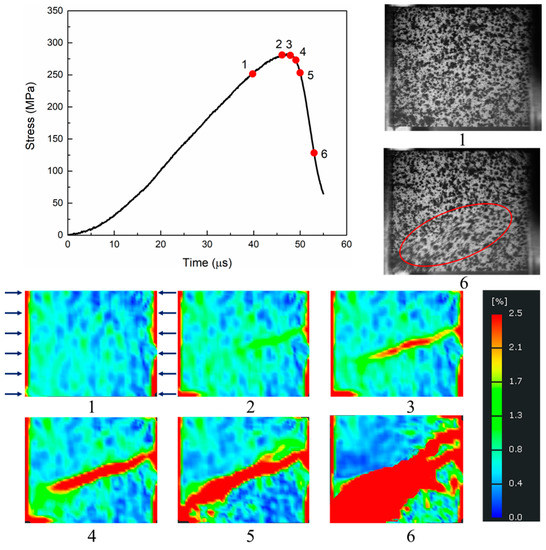 To validate the phenomenon observed in Figure 5, specimens with speckles were also tested using high-speed camera. Figure 6 shows a representative result. The strain field confirmed that the crack initiated in the center of the specimen instead of corners. Before the peak stress was reached, the specimen’s strain field showed a uniform compressive deformation. And after the peak stress is reached, the specimen collapsed into pieces in a very short time. Zig-zag crack and crack propagation velocity was also confirmed from pictures 3–6. And another crack showed on the surface of the specimen, together with the former crack to form a band which finally caused the collapse of the specimen as shown in picture No. 5–6.