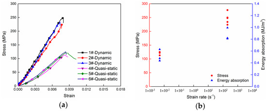 Stress-strain curves are shown in Figure 7 and tabulated data is presented in Table 1. The stress was calculated directly through the usual SHPB technique (Equation (1) in Section 2). Under dynamic loading, the strength (247 MPa in average) was almost two times higher compared to quasi-static loading (120 MPa in average). But they share nearly the same failure strain. Energy absorption is much larger under dynamic loading. Stress and energy absorption vs. strain rate curves are shown in Figure 7b.