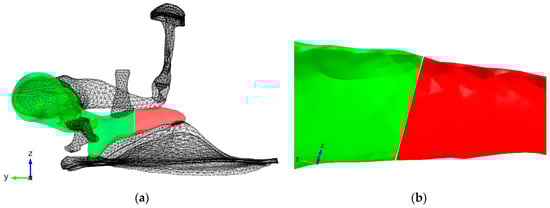 (a) A middle ear geometry used in this study. The change in color in the malleus shows the location at which the fracture was introduced; (b) A close up of the fracture showing the gap between the fractured parts.