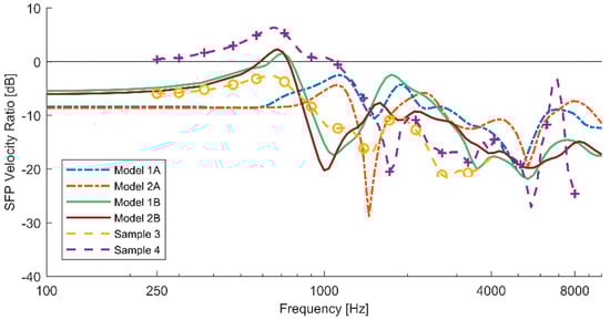 The fractured models without prestress reduction (1A & 2A) show an SFP velocity ratio of about −8.5 dB (Figure 3). The first local maximum occurs at around 1100 Hz with ratio values of −2.5 dB and −4.3 dB for model 1A and 2A respectively. Above 1100 Hz, a steep decrease is observed. At around 2000 Hz, the velocity ratio increases again, almost reaching the same levels as the first local maximum. Between 2000 Hz and 4000 Hz, the ratio is about −10 dB. A dip occurs at around 5 kHz, after which the ratio increases again. The SFP velocity ratio is negative at all frequencies.