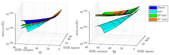 General Variance of the , , and estimators when an unknown excitation is present. The unknown attenuation excitation regarding the known excitation is: (a) −50 dB; (b) −10 dB.