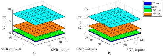 Mean execution time of the , , and estimators when an unknown excitation is present. The unknown attenuation excitation regarding the known excitation is: (a) −50 dB; (b) −10 dB.