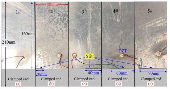 Five specimens used in this paper are aluminum rectangular plates of length 210 mm, width 80 mm and thickness 1.43 mm. As depicted in Figure 1, the specimens are clamped at one end and work as cantilever plates, the size of their free part is 165 × 80 × 1.43 mm3. Among these plates, one plate was in good condition (Figure 1a), the other four specimens as shown in Figure 1b–e have a side slit at the root with a length of 20 mm, 40 mm, 60 mm and 70 mm cut by electrical discharge machining, respectively.