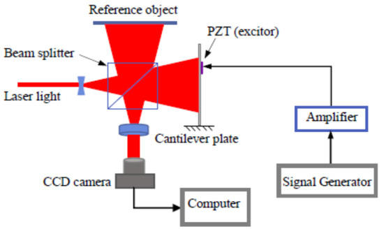 The plates under test are excited by a small PZT actuator with diameter of 10 mm and thickness of 0.4 mm. The PZT actuator is attached the opposite face of the measured surface, the nodal lines should be avoided which can be predicted by FEM in advance. Thanks to the repetition of the PZT excitation, harmonic wave-field is formed in the tested plates and generate deflection displacement. Figure 2 illustrates the schematic diagram for deflection vibration measurement using the time-average electronic speckle pattern interferometry (ESPI) in this study. For the space limit, the measurement principle of ESPI method is not introduced in this paper, the readers can refer the literature [11] for detail. The sinusoidal vibration is measured during a frequency sweep using the optical setup illuminated in Figure 2. In the present study, a laser light with 80 mW and wavelength of 671 nm is used as a coherent light source. To achieve the sinusoidal output, a digitally controlled function generator (RIGOL DG1022Z) with maximum output frequency of 25 MHz connected to a power amplifier is employed.