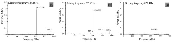 The forcing amplitude and corresponding response modes of the tested intact plate is experimental investigated. In order to determine the predominant response frequency, a high-speed camera was employed, and three series images of the intact specimen during its vibrating at frequencies of 124.45 Hz, 207.43 Hz and 622.4 Hz (622.4 Hz is its natural frequency of the first fourth mode) were recorded, respectively. All images were recorded at speed of 2000 fps. The intensity of one point was obtained from the series images (the number of selected images calculated is 1000 frames for each series.) by LUT and its FFT spectra is plotted as in Figure 4. As presented in Figure 4, when the forcing frequency is equal to 1/3, 1/5, even 1/7 of the natural frequency, the corresponding response modes measured by experiment are almost same as the natural mode shape. It can be found immediately that the principal response frequency is five times and three times than the input forcing frequency in Figure 4a and 4b, respectively. Due to the component presence of five times or three times of the input frequency, the tested specimen exhibits a superharmonic resonance.