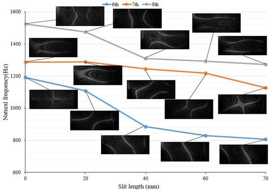 Mode 6, 7 and 8 variation with the slit length increasing.