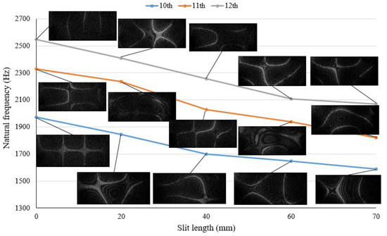 As expected, the resonant response of the plates with root-slit become sensitive to the slit length increasing. In order to closely see the mode shapes variation with the slit length increasing, two representative case are presented in Figure 6 and Figure 7. Figure 6 depicts mode 6, 7 and 8 variation as the slit length increasing, which shows that mode 6 changes its mode from shape (2, 1) to shape (3, 0) with the slit length variation, while its natural frequency is sensitive to slit length variation. Due to slit length variation, mode 7 varies modal shape (0, 2) into (2, 1), and mode 8 switches modal shape (4, 0) to shape (0, 2). For higher modes 10, 11 and 12, it can be observed from Figure 7 that response shapes are more affected by the length of slit and become complicated. [Note: the definition of mode shape (m, n) can be found in textbooks of Vibration Theory. Here, m stands for modal order of the bending, and n is for modal order of the torsional vibration.]