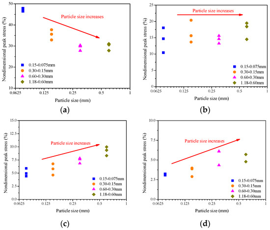 Peak stress attenuation of coral sand with different particle sizes at different distances. (a) 75 mm; (b) 150 mm; (c) 225 mm; (d) 300 mm.