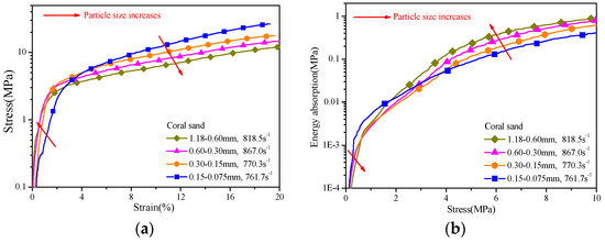 Stress-strain curves and energy absorption curves for coral sand with different particle sizes. (a) Stress-strain curves; (b) Energy absorption curves.