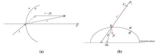 According to the laws of refraction in vector form (Figure 1a), we can know the incident ray, the refractive ray, and the normal are coplanar. If we know the incident ray and the refractive ray, the normal can be linearly represented by the incident ray and refractive ray as: