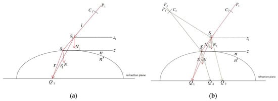 As shown in Figure 1b, when calculating the normal direction, we know that the incident ray must pass through the camera’s optical center C1 in the pinhole camera model. Assumed that Q1 is the point of the corresponding refractive ray on the refraction plane, S is the object point, the incident ray and the refractive ray can be expressed as [7]: