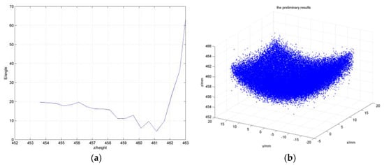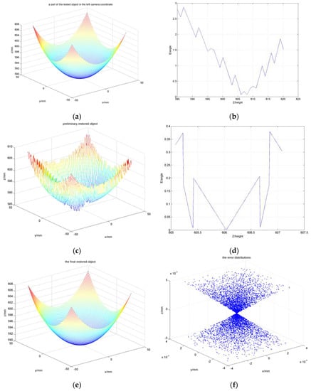 In simulation, the resolution of both cameras is 1200 × 1600, and the focal length of the two camera is 5905.1 pixel and 5862.4 pixel. The refractive index is 1.7. It is assumed that the tested object is a sphere with a radius of 100 mm, and assumed that there is only one refraction and the refractive ray will hit the fringe screen, which is located at the z = 0 mm. The tested object is shown in Figure 3a in the left camera coordinate system. In Figure 3b, it shows the relationship between the angle and the candidate z coordinate for one pixel. The restored object after one calculation is shown in Figure 3c. The final relationship between the angle and the candidate z coordinates after iterative process, and the final object shape are shown in Figure 3d,e. The reconstruction error is shown in Figure 3f. The simulated original and deformed grating are shown in Figure 4a,b.