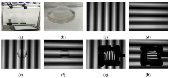 (a) The experimental setup; (b) the tested plano-convex lens; (c,d) the captured original standard sinusoidal fringes in the vertical and horizontal directions, respectively; (e,f) the fringe images by placing the plano-convex lens directly on the monitor; (g,h) the fringe images by placing the plano-convex lens above the monitor.