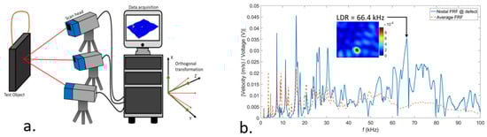Local defect resonance (LDR) has already been described in the early 1990s [9], though it is only recently that the technique has been explored extensively through the work of Solodov [5,10]. Instead of classical vibration testing of components at low frequencies, the LDR technique rather employs elevated frequencies. Considering that a defective area has a locally different stiffness and/or mass, it will behave as a local resonator at specific elevated frequencies. The vibrational surface response can then be measured with scanning laser Doppler vibrometry (see Figure 2a). Hence, it is not a volumetric method, but rather a surface inspection method. In various research papers, the potential of the LDR technique has been demonstrated for a range of defects [5,6,10,11,12,13]. Recently, the LDR phenomenon has also been extended towards in-plane resonances, and it was shown that the concept of in-plane LDR is advantageous for detecting specific defect types [14]. Though, a current difficulty with the LDR technique concerns the fact that it is often not easy to actually identify the LDR response and the LDR frequency in measurement data. This is demonstrated in Figure 2b which displays the frequency response function (FRF) for a [45/0/-45/90]3S CFRP with a flat bottom hole (FBH). The orange curve is the average FRF of the CFRP, while the blue curve represents the nodal FRF at the FBH’s location. This figure indicates the difficulty to distinguish between global mode shapes and LDR behavior by analysis of the average FRF, or even the nodal FRF in the defected zone. However, by careful manual inspection of the operational deflection shapes (ODS) over the full frequency range, a clear LDR of the FBH was found at 66.4 kHz. Our current research is focused towards automated identification of LDR features in a set of FRFs, and will be presented at the EWSHM 2018 conference. Though, it may be clear that the actual opportunities and limitations of the LDR technique for NDT of composites are not yet fully known.