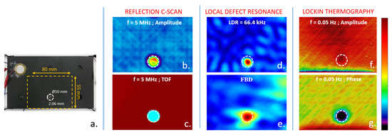 Results for CFRPFBH: (a) photograph of inspected area. Ultrasonic C-scan at 5 MHz: (b) reflected amplitude and (c) TOF. Vibrational testing: (d) LDR at 66.4 kHz and (e) frequency band data FBD over 50–100 kHz. Lock-in thermography at 0.05 Hz: (f) amplitude and (g) phase image.