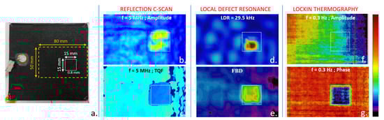 Results for CFRPINSERT: (a) photograph of inspected area. Ultrasonic C-scan at 5 MHz: (b) reflected amplitude and (c) TOF. Vibrational testing: (d) LDR at 29.5 kHz and (e) frequency band data FBD over 5–100 kHz. Lock-in thermography at 0.3 Hz: (f) amplitude and (g) phase image.