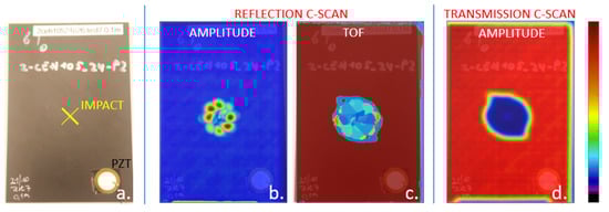 The ultrasonic C-scan is perhaps the most widespread NDT technique [2]. In this technique, the surface of an immersed sample is scanned (see Figure 1), and a projection of the reflected and/or transmitted ultrasound is analyzed. Hence, it is a volumetric inspection method. The transmission C-scan leads to an integrated view of the damage zone, while the reflection C-scan provides details on the depth distribution of the damage zone (see Figure 1b). Typical frequencies are in the low MHz range (1–10 MHz) for composite materials. Lowering the frequency leads to poor spatial resolution as depth profiling is directly related to the ultrasonic wavelength. Increasing the frequency leads to excessive attenuation of the ultrasonic signal in composite materials due to high damping properties of the polymer matrix and scattering at fiber bundles and porosities.