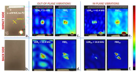 The LDR response for the CFRPBVID sample is displayed in Figure 6. In this case, it is difficult to identify 1 single LDR frequency, exactly because of the complexity of the damage zone. The fact that LDR is not a volumetric inspection method combined with the complex 3D damage zone (see Figure 5b,c) is not favourable for clear interpretation. Therefore, the CFRPBVID has been scanned at both the impact side and the backside, see Figure 6 (top row) and Figure 6 (bottom row) respectively. Additionally, the vibrational analysis was further extended towards in-plane LDR phenomena in order to get further insight on the structure of the complex 3D damage zone [14]. For clarity, the classical out-of-plane LDR is indicated by LDRZ, while in-plane LDR is indicated by LDRXY. By careful manual peak-picking, LDRZ and LDRXY modes have been identified. The results indicate that the extension towards in-plane vibrational characteristics give access to other defect parameters. As there are many higher-order LDRZ and LDRXY modes identified in the considered bandwidth, we opted to only show the fundamental LDR’s together with a representation of the out-of-plane frequency band data FBDZ and in-plane frequency band data FBDXY over the total frequency band of 2–100 kHz. The increased surface velocities of the many high order LDRs in the total frequency band should be hinted in the FBDZ and FBDXY, and thus should give a representation of zones with reduced stiffness (i.e., damaged zones). The results are displayed in Figure 6c-f, and qualitatively match the ultrasonic C-scans (see Figure 5). It is clear that this set of results provides useful information, but it is equally clear that further research is needed in order to interpret these results, and eventually to link them to quantitative defect parameters.