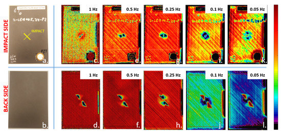 IRT in reflection of impact side (top row) and backside (bottom row) of CFRPBVID: (a,b) photograph; phase images at (c,d) 1 Hz, (e,f) 0.5 Hz, (g,h) 0.25 Hz, (i,j) 0.1 Hz and (k,l) 0.05 Hz.