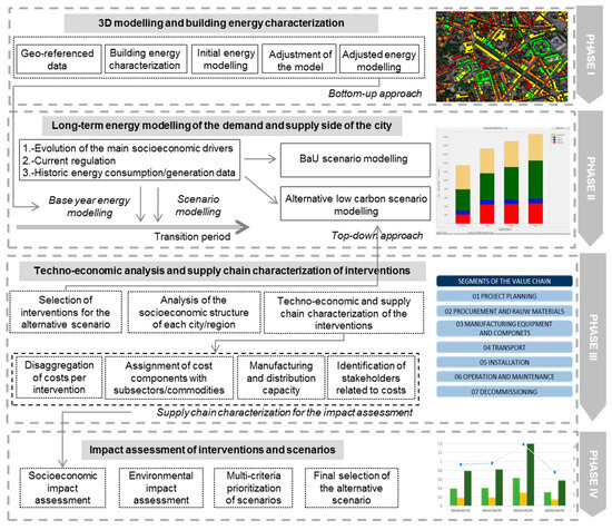 The energy modelling methodology described in this section is integrated in a wider urban transformation planning approach. More precisely, it represents the most technical part of the planning process and complements other non-technical evaluations that run in parallel to this methodology. The methodology proposed is composed by the four main phases of the figure below (Figure 1).