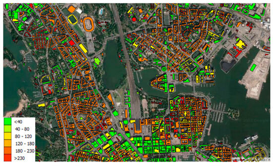Modelling results for the heating demand (kWh/m2 year) of the buildings of Helsinki.