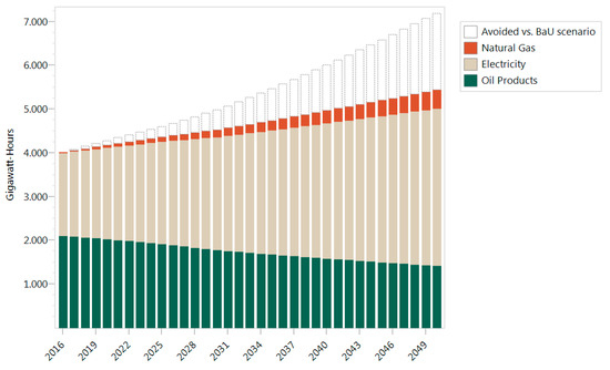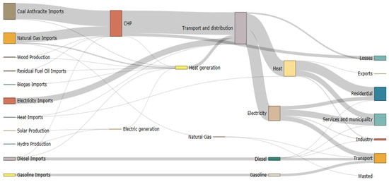 The main energy data of the city has been provided by the local government for the base year 2016. In the demand side, this information has been disaggregated by sectors completing the model with other information sources such as the database of the City Performance Tool [21]. Residential sector has been disaggregated by subsector; private residences (84%) and city owned buildings (16%). The disaggregated energy data for the residential sector has been completed by using the data generated by the modelling phase described in the Section 3.1. Final energy consumption in residential accounts for 5738.2 GWh in the base year. Heat from the district heating network is the most used fuel with 70.9%, followed by electricity (26.4%) and diesel (2.6%). In the services and municipality sector the electricity represents the main energy consumed (52.25%), followed by heat from the district heating (46.96%) and diesel (0.79%). The electricity consumption of street lighting is 46.8 GWh [21,22]. In the transport sector, road transport sums up 2133.8 GWh, while rail transport accounts for 1876.6 GWh. Cars are the most-consuming vehicle type in road transport and represent 63.79% of the energy use in this subsector. Although electricity is the most consumed fuel in the transport sector (47.12% in opposition to 26.75% gasoline and 25.88% diesel) it only represents 0.65% in the road transport against 50.28% gasoline and 48.61% diesel.