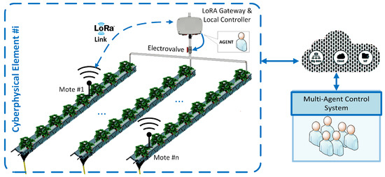 This approach considers the fertigation crop growing system equivalent to an industrial production line where the raw material enters, a set of operations is performed and the final product is created. In this case, the mixture of fertigation, solar radiation and relevant environmental variables are the raw input material. The photosynthesis and other biological functions are compared to the operations performed and the vegetable matter generated the final output. Due to the similarity between common industrial processes and the production scheme based on fertigation, it makes sense to migrate some of the concepts presented in the Industrie 4.0 paradigm to this agricultural production reality. In particular, those that lead to an increase in robustness, adaptability, lean and waste reduction. Among other approaches, the use of decentralised agent-based control methods has proven to be an efficient solution in the management of complex industrial systems. Those agents will responsible to locally manage each cyberphisical cluster. Each cyberphysical elements is composed of areas of vegetative production, sensor networks and local control of the state of irrigation. In a typical fertigation production system, there will be a large number of cyberphysical elements that must be scaled up or down according to the production schedule. Notice that, although each cyberphysical element is considered to have local processing capacity, these will be vertices in an integrated system that will take place on a cloud computing platform (FIWIRE). This work deals with the cyberphisical element architecture which will be present in the next section.