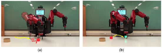 Experimental setup with the Baxter robot. (a) Pushing skill; (b) Grasping skill.