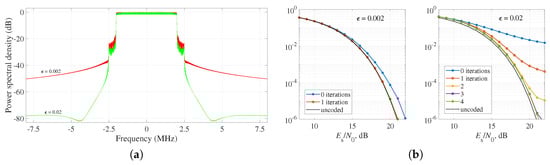 Proposed precoder design with , . (a) PSD for different values of . (b) SER in AWGN channel for the proposed iterative decoder.