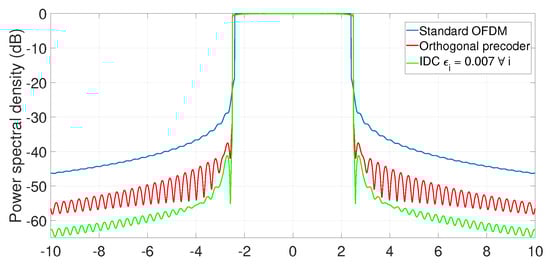 In the third example, we consider a bandwidth-limited scenario with only cancellation subcarriers available. In this case, the orthogonal precoder requires 4080 cmults/symb at both transmitter and receiver. The OBR reduction obtained by orthogonal precoding can be improved if one uses IDC (individual distortion constraint) precoding instead, at the cost of additional complexity. Figure 3 shows an example with . In this case, the decoder requires a single iteration. The complexity incurred is 9160 and 7112 cmults/symb at the transmitter and receiver, respectively.