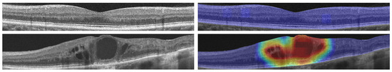 The network was trained using a base dataset of 3247 samples from two different representative OCT capture devices, increased by means of data augmentation. Additionally, the training of the network was done by using an automated control of the learning rate depending on the validation results, and stopped by means of an early-stopping criteria that detects when the training quality has stagnated. To further study the capabilities of our system, the training process was repeated 50 times, randomly distributing the training and validation datasets and recalculating the data augmentation procedure. After all the repetitions, the system attained a satisfactory mean test accuracy of 97.45% ± 0.7611 and a mean area under the ROC curve (AUC) of 0.9961 ± 0.0029. Regarding maps, as shown in Figure 1 and Figure 2, the DenseNet architecture is able to successfully represent both pathological and healthy regions in different representative devices of the domain.