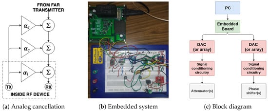 The aim of building an analog cancellation setup is performing a first power reduction of self-interference signal so that receiver analog front-end interface will not be saturated or damaged. A real-hardware full-duplex setup may suffer from two main sources of self-interference, as shown in Figure 2a: internal coupling (, signal power fraction that leaks between transmission and reception interfaces of most radio platforms), and external coupling (, fraction of RF transmitted signal that leaks into the receiver chain through the antenna interface). For attenuating interference, a parallel branch () is introduced. The ideal value for this branch is the counterphase replica of the sum of the internal and external coupling signals, that is, . With this value, self-interference would disappear. The parallel branch is based on a small network consisting of a set of voltage-variable attenuators and phase shifters, controlled from a PC through an embedded-system-based design, as shown in Figure 2b. Values of attenuation and phase to be generated by the RF devices network are calculated iteratively. These values are then transposed into codes by the embedded system and sent to the DACs (Digital-to-Analog Converters), so that the network can perform a real-time adaptation to changes in coupling.