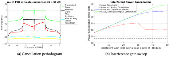 The base transmission signal, without any RF gain, has a power level of −48 dBm for these experiments. On the one hand, for results shown in Figure 3a, a RF gain of 50 dB is applied. Lines are Welch periodograms: yellow line, of the noise floor; green line, of the transmitted self-interference signal; black line, of the raw self-interference received signal; and red and blue lines, of the same received signal after analog cancellation and analog plus digital cancellation respectively. It can be seen that cancellations can lower self-interference signal power about 80 dB. LMS and APA algorithms perform similarly in terms of cancellation. On the other hand, for results shown in Figure 3b, a self-interference RF gain sweep has been performed. It can be seen that cancellation ratio grows in a linear proportional way with interference gain, so self-interference power level is below noise floor with lower values of RF interference gain. These results show that measured performance is enough to recover signal from a far transmitter. Besides, performance in terms of MER measured using this full-duplex scheme is comparable to the one measured using a traditional half-duplex scheme.