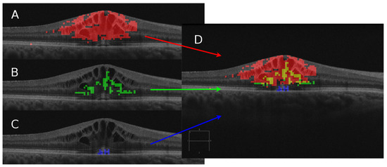 The three individual DME detections and the final merged pathological map. (A) CME in red. (B) DRT in green. (D) SRD in blue. (D) Global color map.