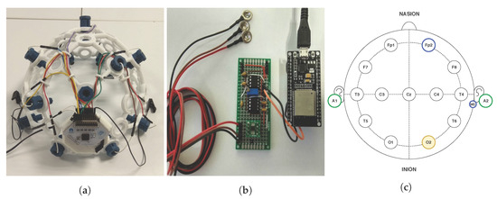 Both open source EEG devices employed in the experiment (Figure 1a,b). Figure 1c shows the electrode position used by the self-designed prototype (bordered by blue) and the OpenBCI hardware (bordered by green). The O2 electrode represents the common input channel used by both devices (bordered and filled in yellow). (a) OpenBCI device; (b) Self-designed prototype; (c) Electrode locations.