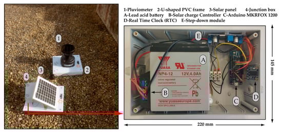 The processing unit consists of an Arduino MKRFOX 1200 and an external DS3231 real time clock (RTC). The power supply module consists of a 6 W 12 V solar panel (Fadisol C-0154B), connected to a Yuasa 12 V 4 A battery through a solar charge controller (Fadisol C-0189). The output of the battery is connected to the Arduino through a step-down, to power the device with the adequate voltage. The power module was designed to guarantee energy supply during long periods even in case of failure of the solar panel. The Arduino samples the number of pulses of the pluviometer’s reed switch and sends the amount of rainfall registered and the corresponding time to a server located in the CITIC (Centre for Information and Communications Technology Research, University of A Coruña) using the Sigfox Communication Network.
