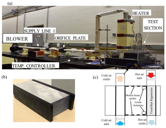 The flow rate to the test section is controlled by adjusting the voltage supplied to the blowers and the air flow rate is measured by the orifice plates on each supply line. One of the air streams is heated to 40 °C (hot stream temperature) using a PID controlled duct heater (Omega AHF- 06120, 600 W) while the other stream is kept at room temperature of 22 °C (cold stream temperature). The temperature of the hot and cold air streams at the inlet and outlet of the exchanger are measured using calibrated T-type thermocouples with an uncertainty of ±0.2 °C. During a test, the heat exchanger is moved periodically between the hot and cold air streams representing a FBR.