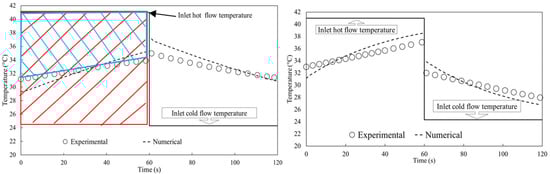 Figure 4 presents numerical and experimental results of the outlet temperature of the FBR for face velocity of 1.6 (m/s). Compared to the lower face velocity (Figure 3), as the face velocity increases the outlet air temperature profile of FBR shifts up during the hot period and shifts down during the cold period. Therefore, the airflow is less cooled during the hot period and less heated during the cold period; this means that the effectiveness is decreased.