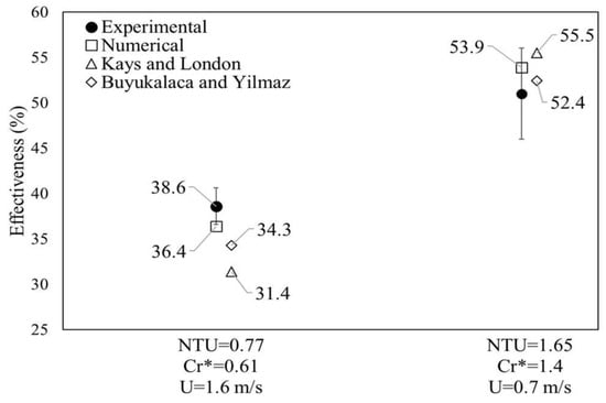Measured sensible effectiveness and comparison with the numerical and empirical correlations of Kays and London [14] and Buyukalaca and Yilmaz [15] for two operating conditions. The error bars represent the experimental uncertainty bounds at the 95% confident interval.