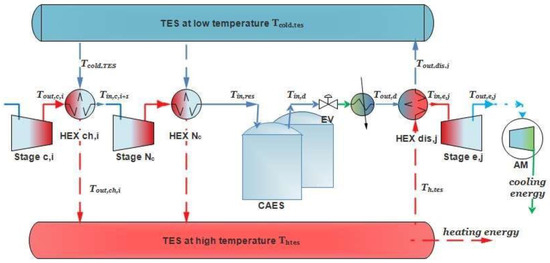 In this study, the configuration proposed of the small-scale T-CAES is shown in Figure 1. The charging phase is composed by multistage compressors with intercooling in order to increase the compression efficiency and the compressed air is cooled before storing to increase the energy density. During the discharging phase the pressure of the air stored is reduced by a throttling or expansion valve (EV) before the turbine. This configuration is based on maximizing the electric efficiency so that the inflow air of the first expansion stages is preheated and the last stage is dedicated to produce cooling energy.